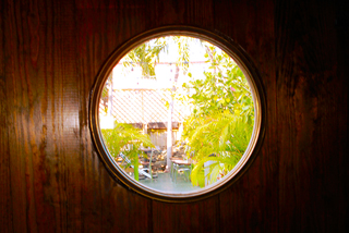 The port hole that now leads travelers to The Courtyard in Nancy’s back patio once was part of a respectable sailing vessel.